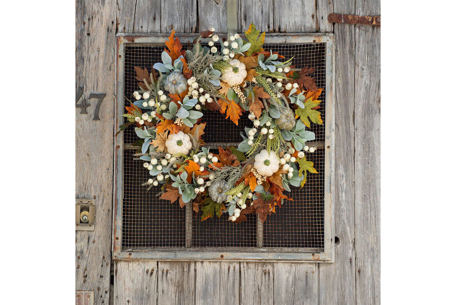**Halloween & Thanksgiving Wreath Hanging | White Pumpkin & Maple Leaf Door Decoration**