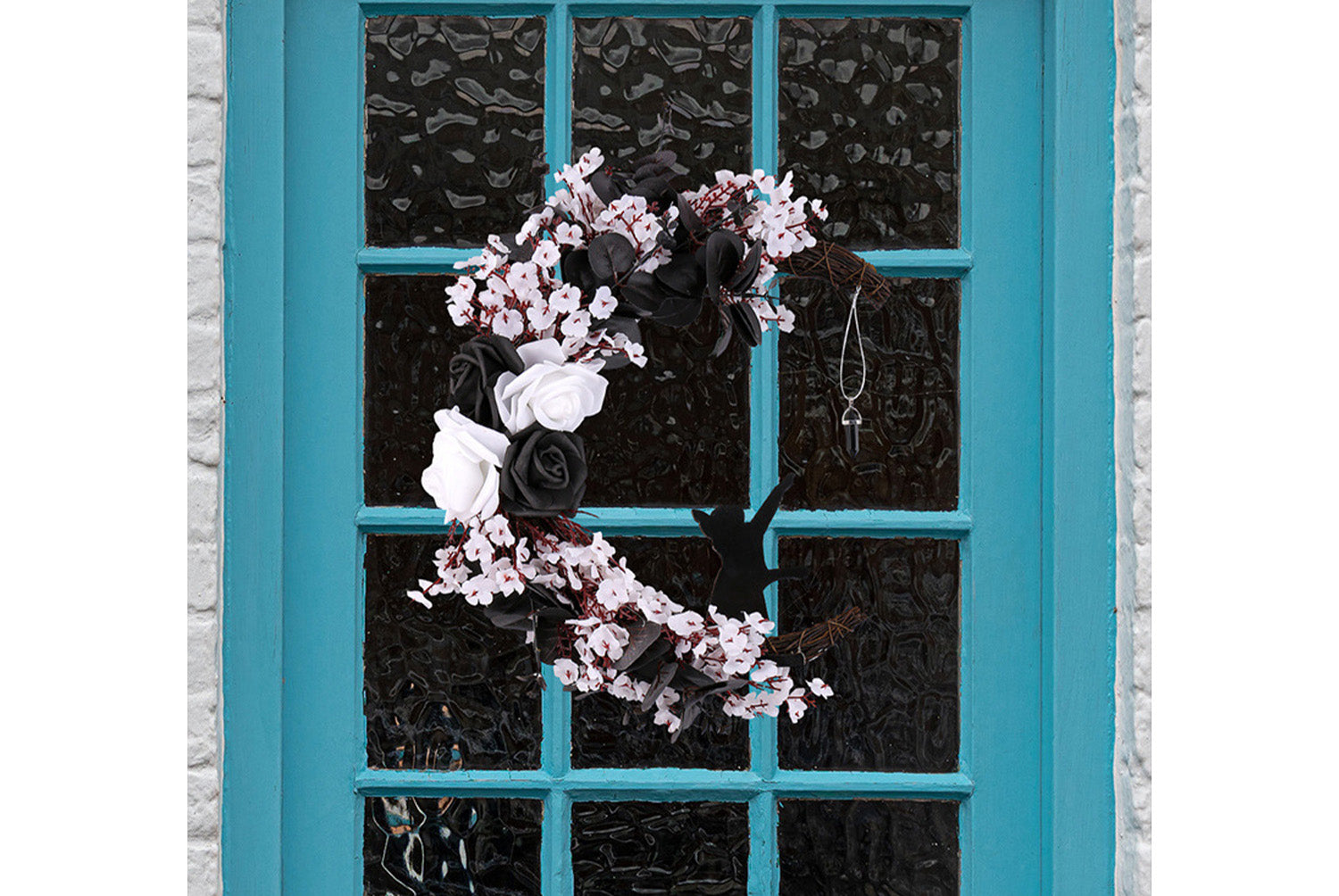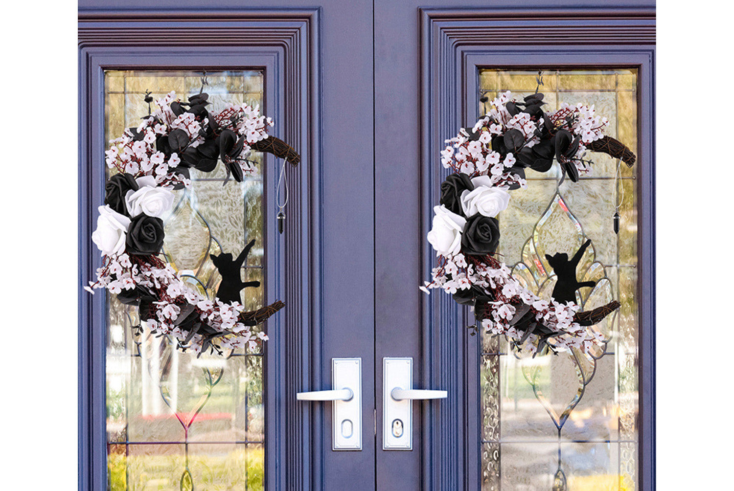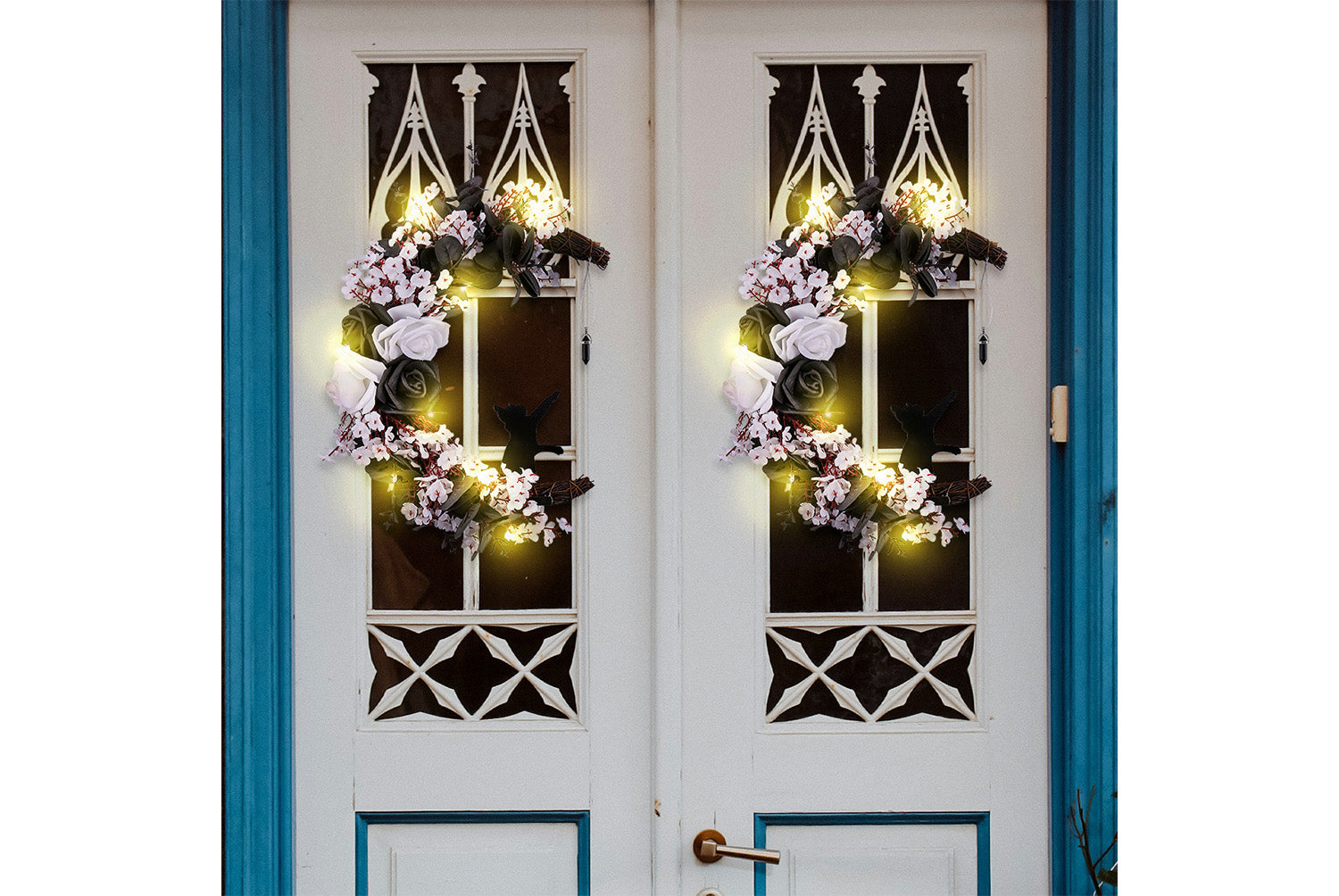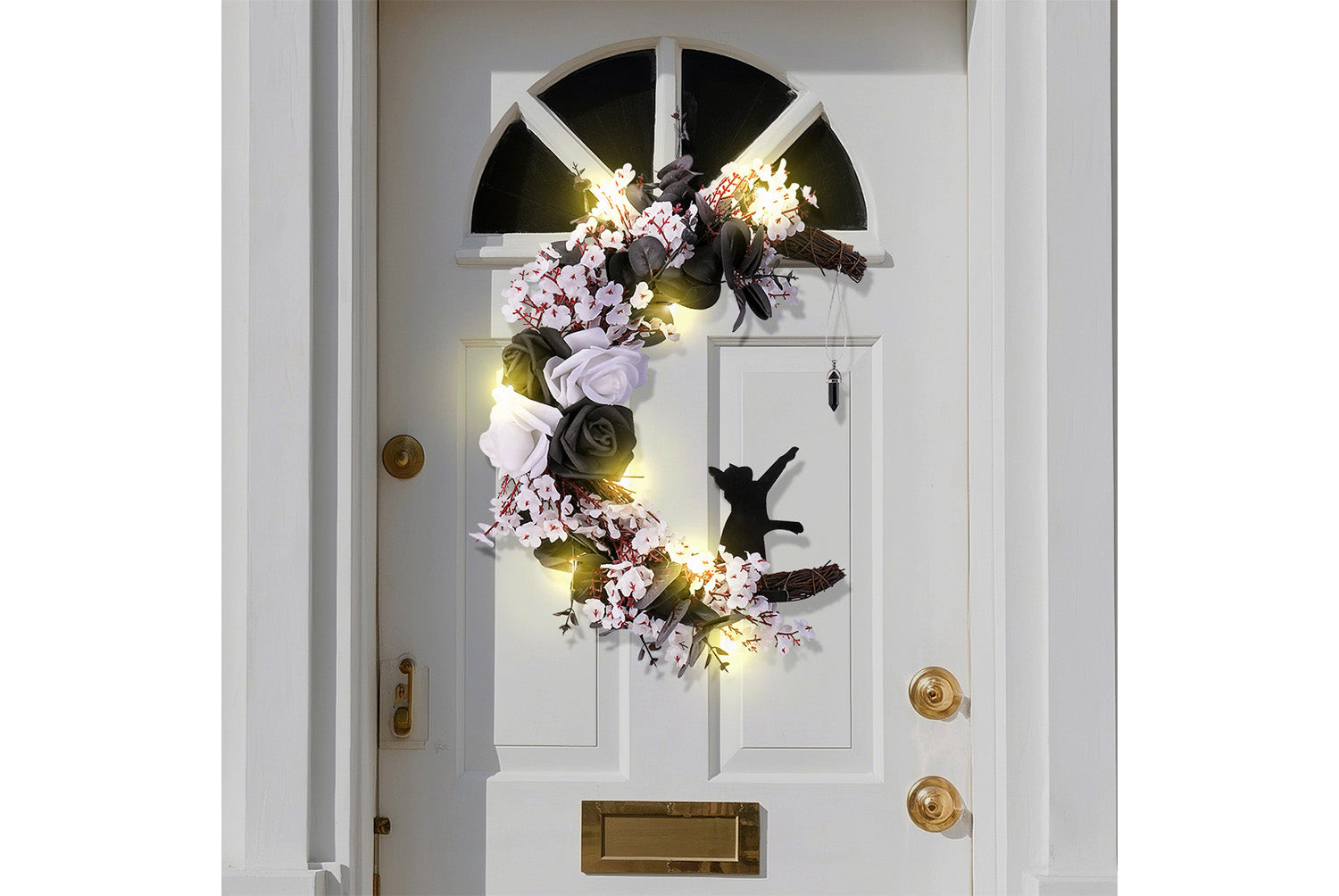 **Halloween White Flower, Black Rose, Dead Branch, Moon Cat Garland | Ghost Festival Vine Wreath Ornament**