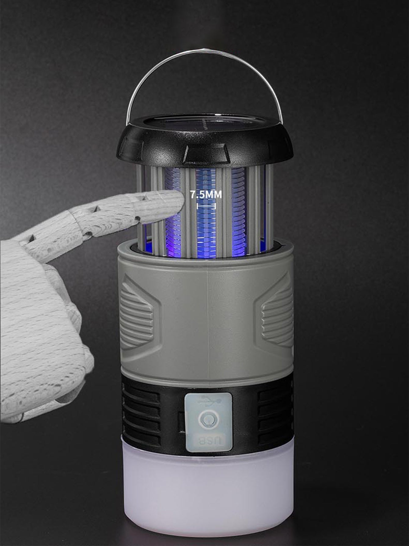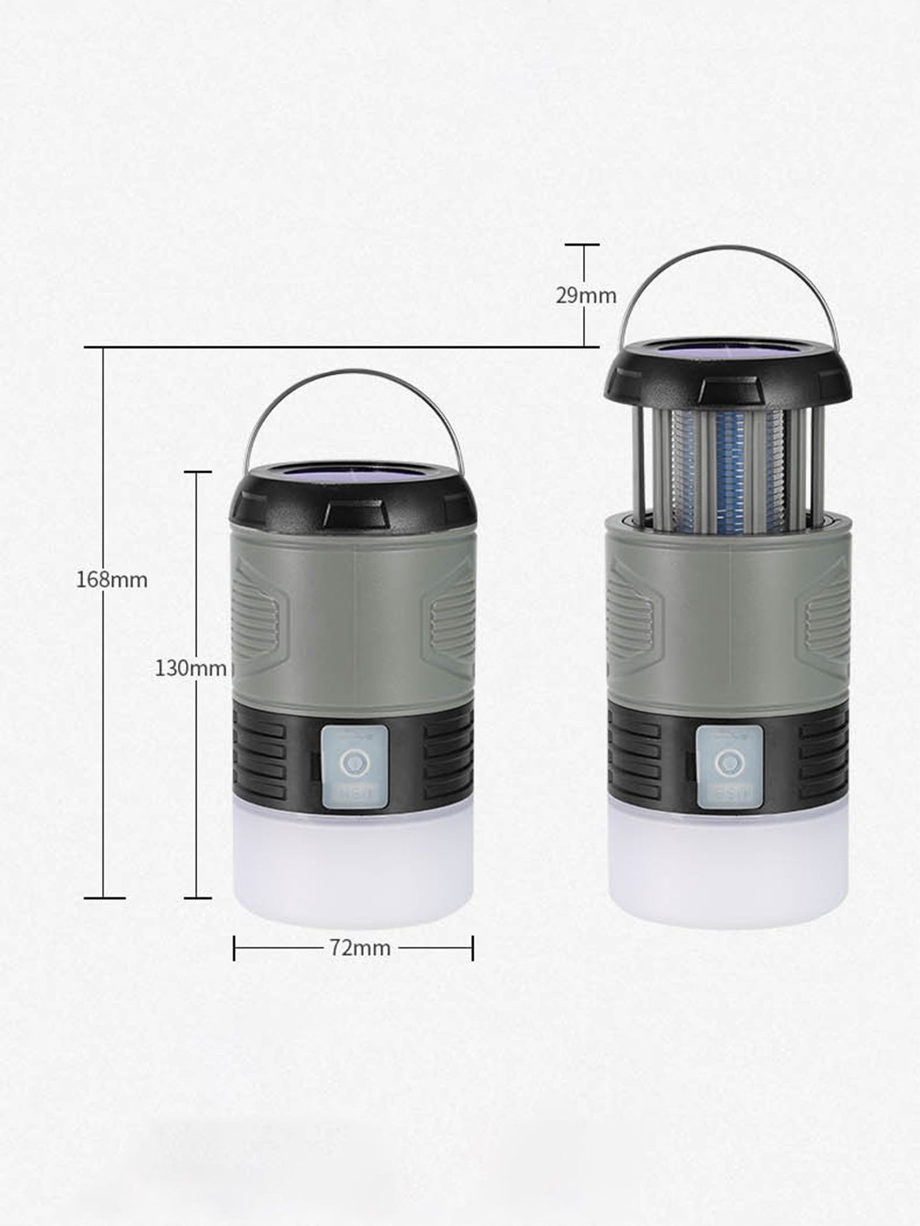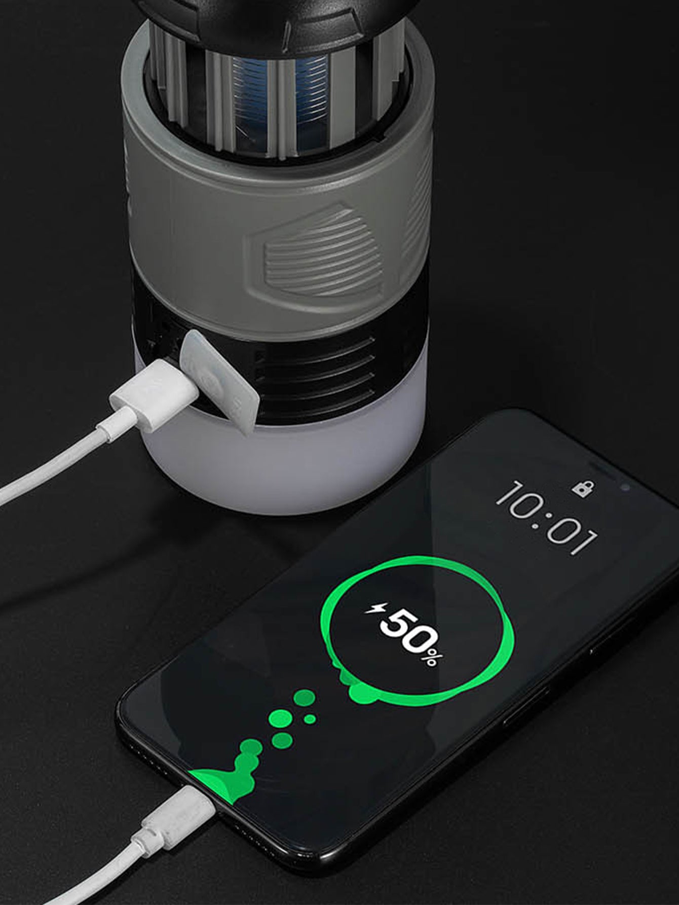 Mosquito Killer Lamp integrates mosquito killing, lighting, and mobile power, and can be used both outdoors and at home. It adopts LED+UV dual light source design, with a lighting brightness of 320LM (floodlight) + 100LM (ultraviolet mosquito luring), a range of 150 meters, and supports three-speed switching of strong light, weak light, and flashing. It can work continuously for 8 hours in mosquito killing mode and 12 hours in lighting mode. It has a built-in 2000mAh large-capacity battery, supports solar charging and Type-C fast charging, and can be fully charged in 4 hours. Press and hold the first gear for 3 seconds to switch to a mobile power supply, and charge your phone at any time. PC+ABS material is light and durable (only 218.6g), with a waterproof design for daily life, suitable for a variety of scenarios.