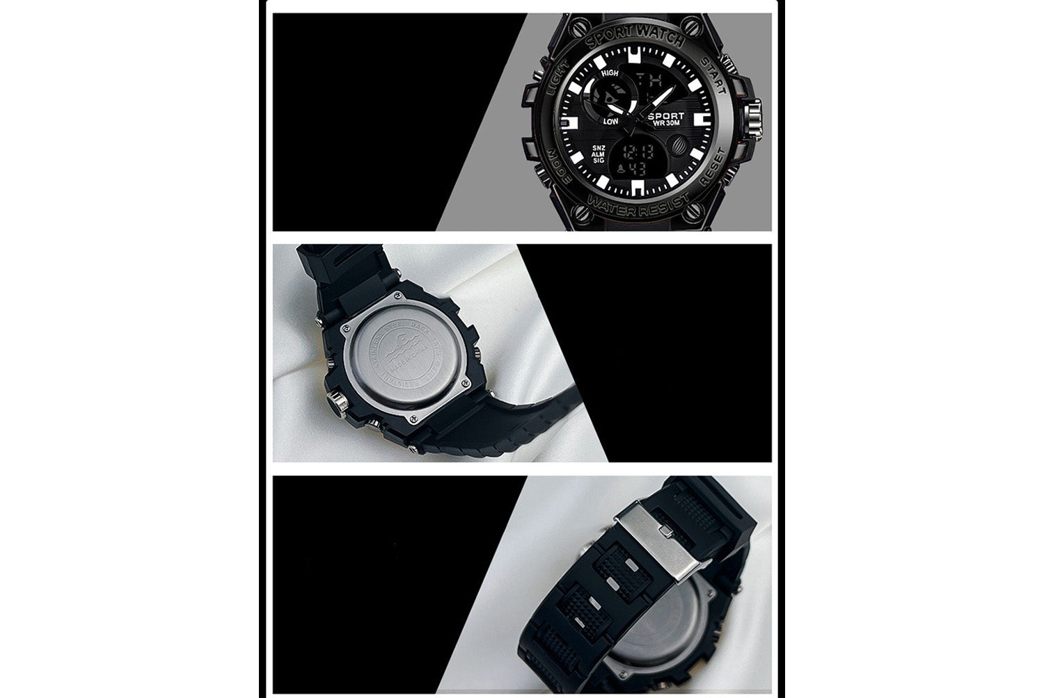 - Zinc alloy case with eco-friendly resin strap