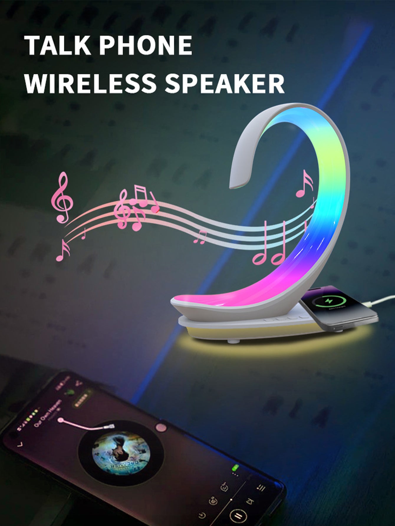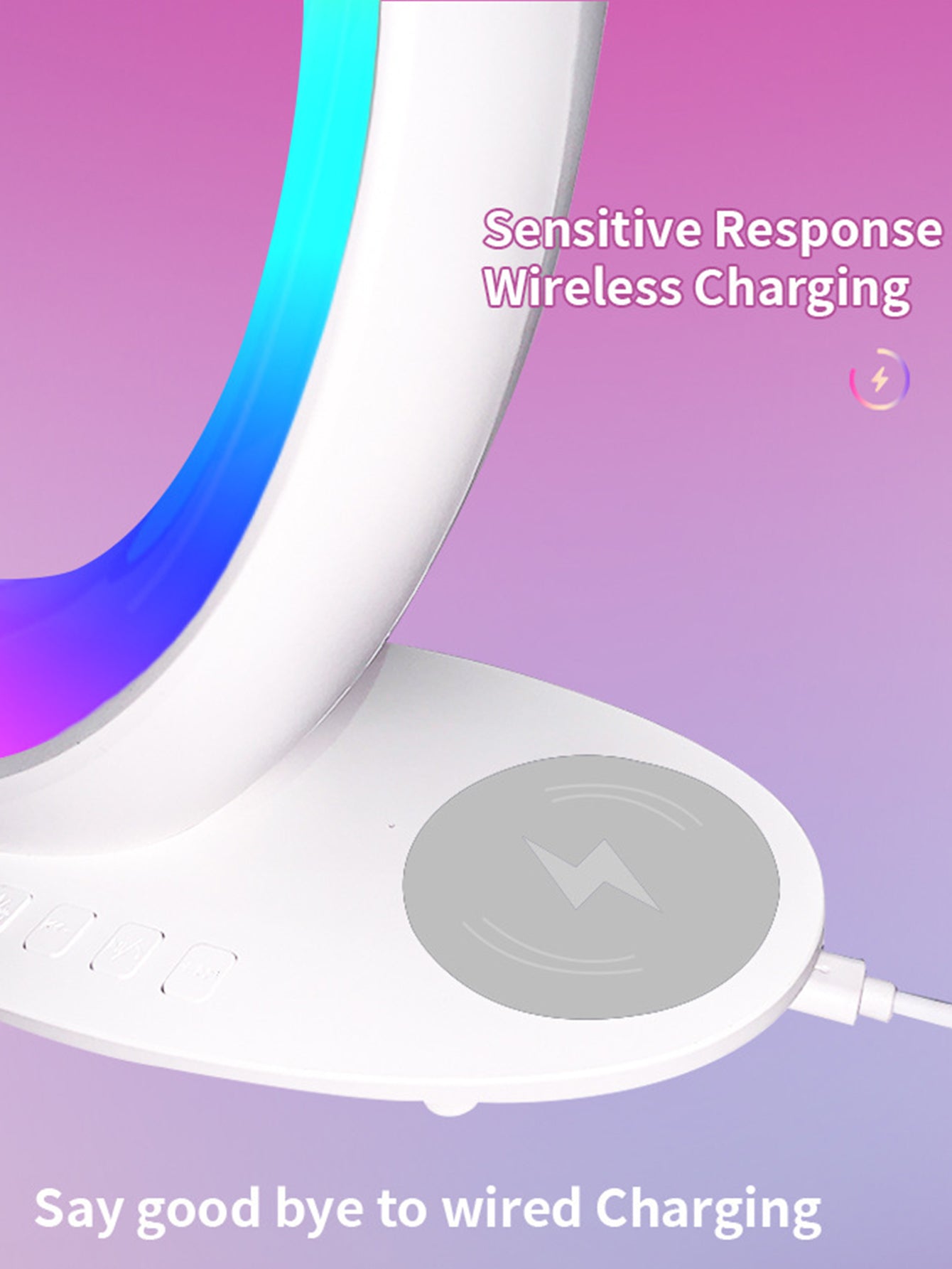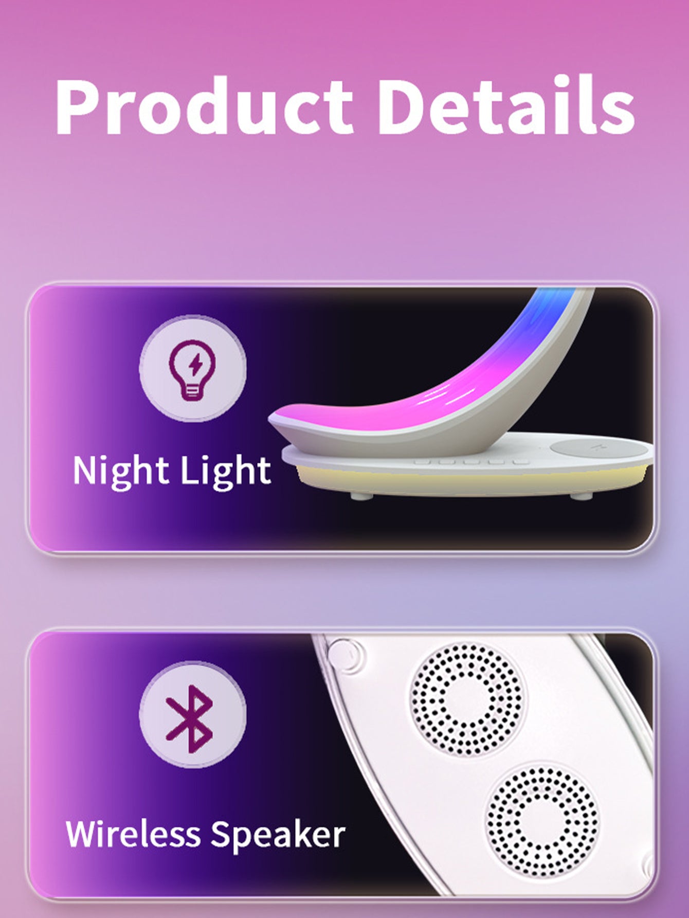 1. **Multifunctional design**: It integrates wireless charging, Bluetooth speaker, table lamp and night light, which is practical and space-saving.