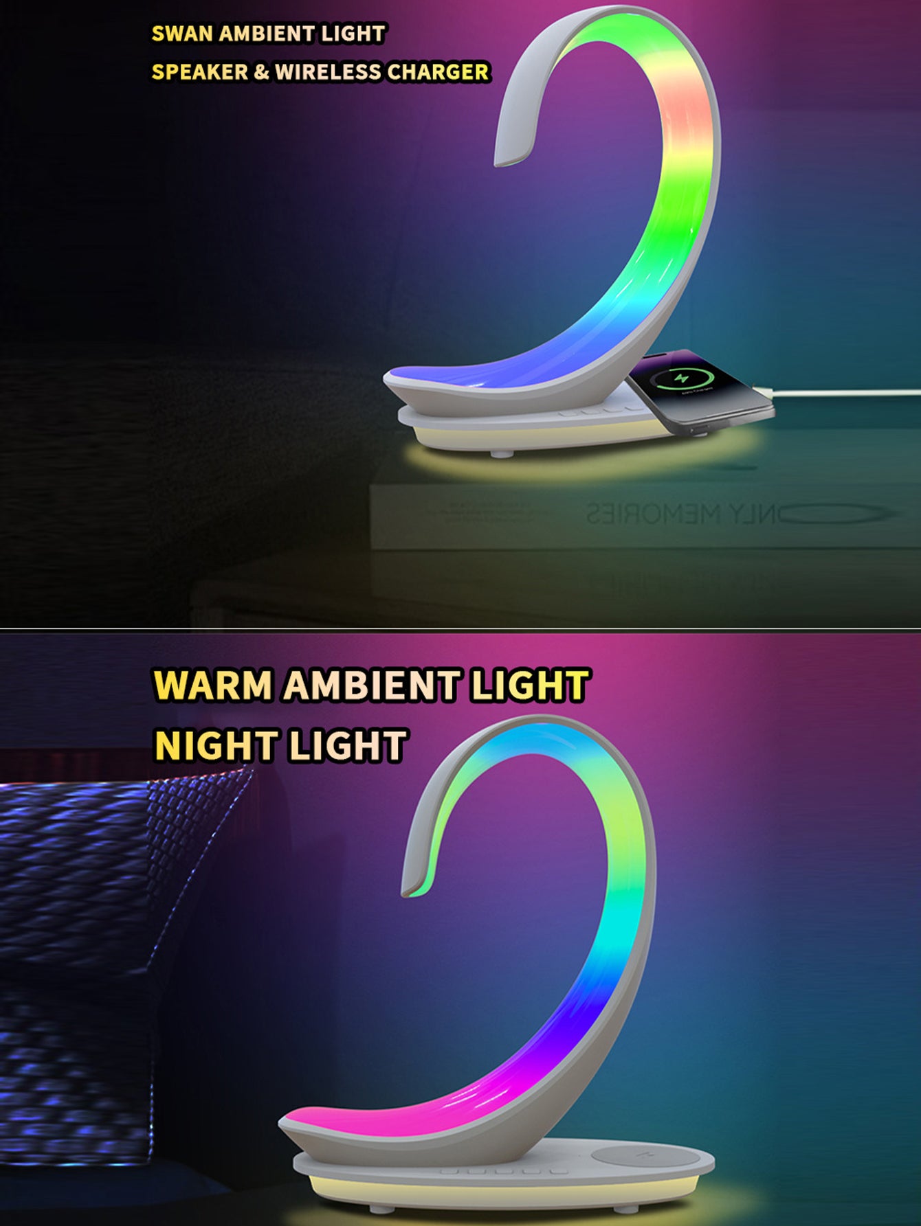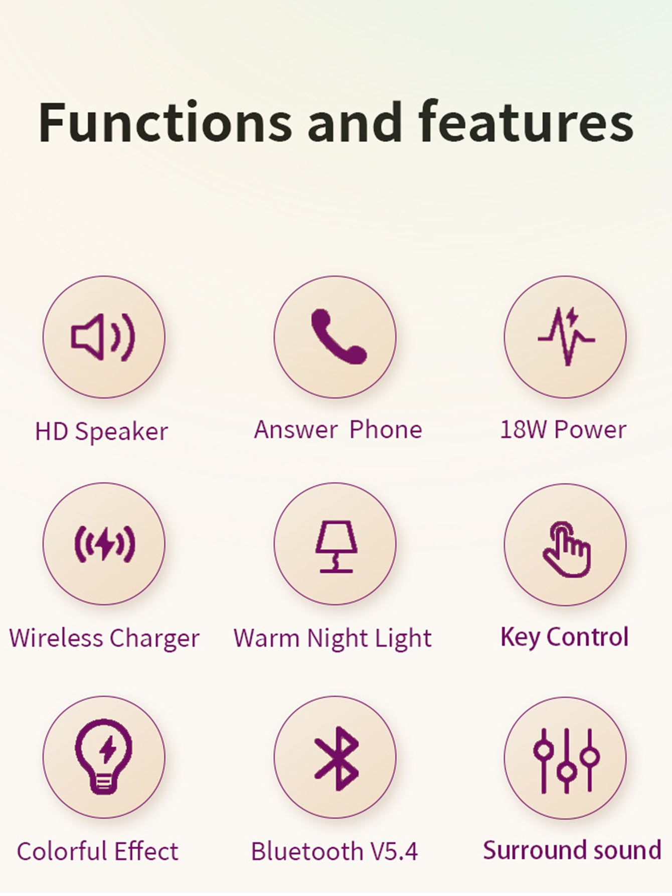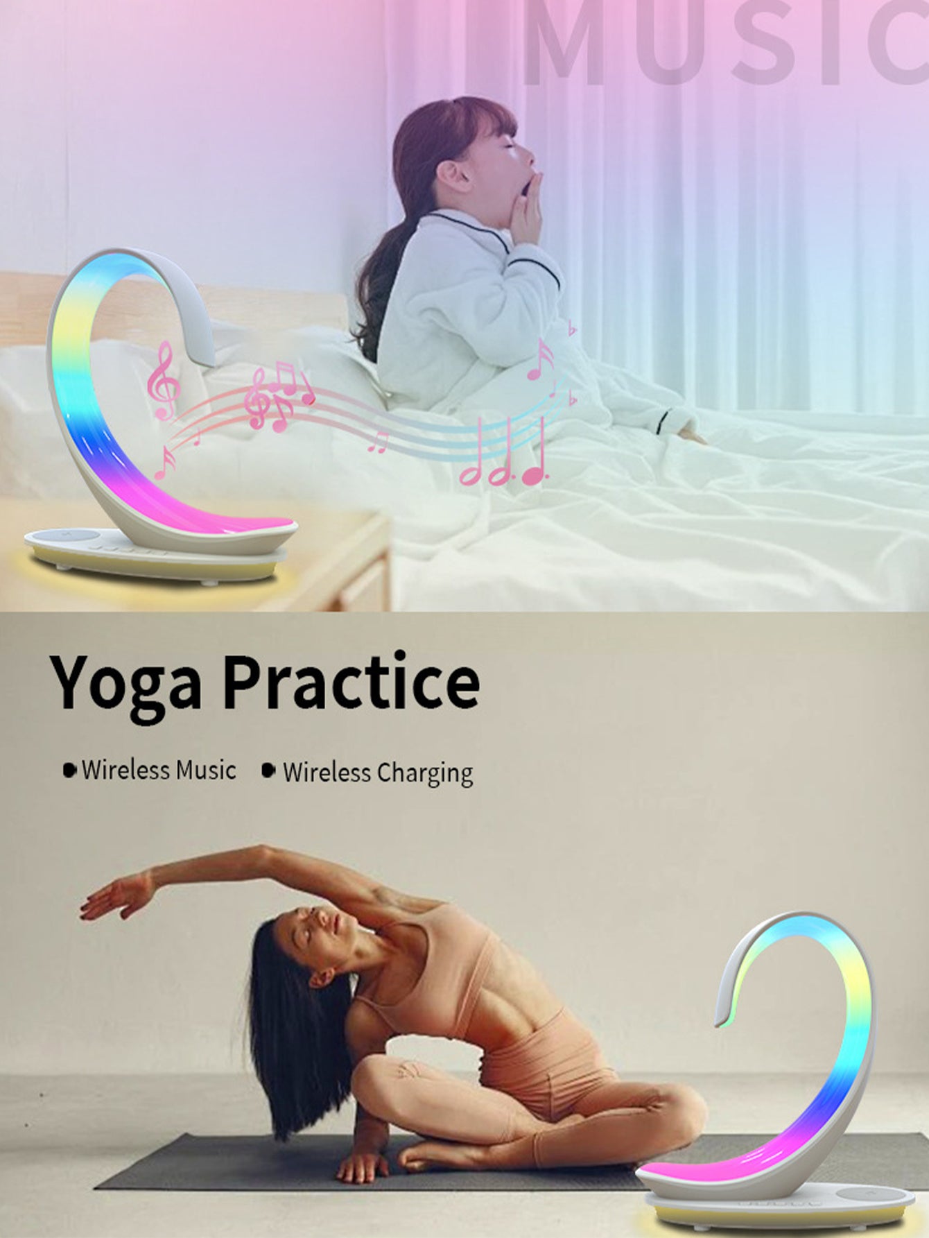 1. **Multifunctional design**: It integrates wireless charging, Bluetooth speaker, table lamp and night light, which is practical and space-saving.