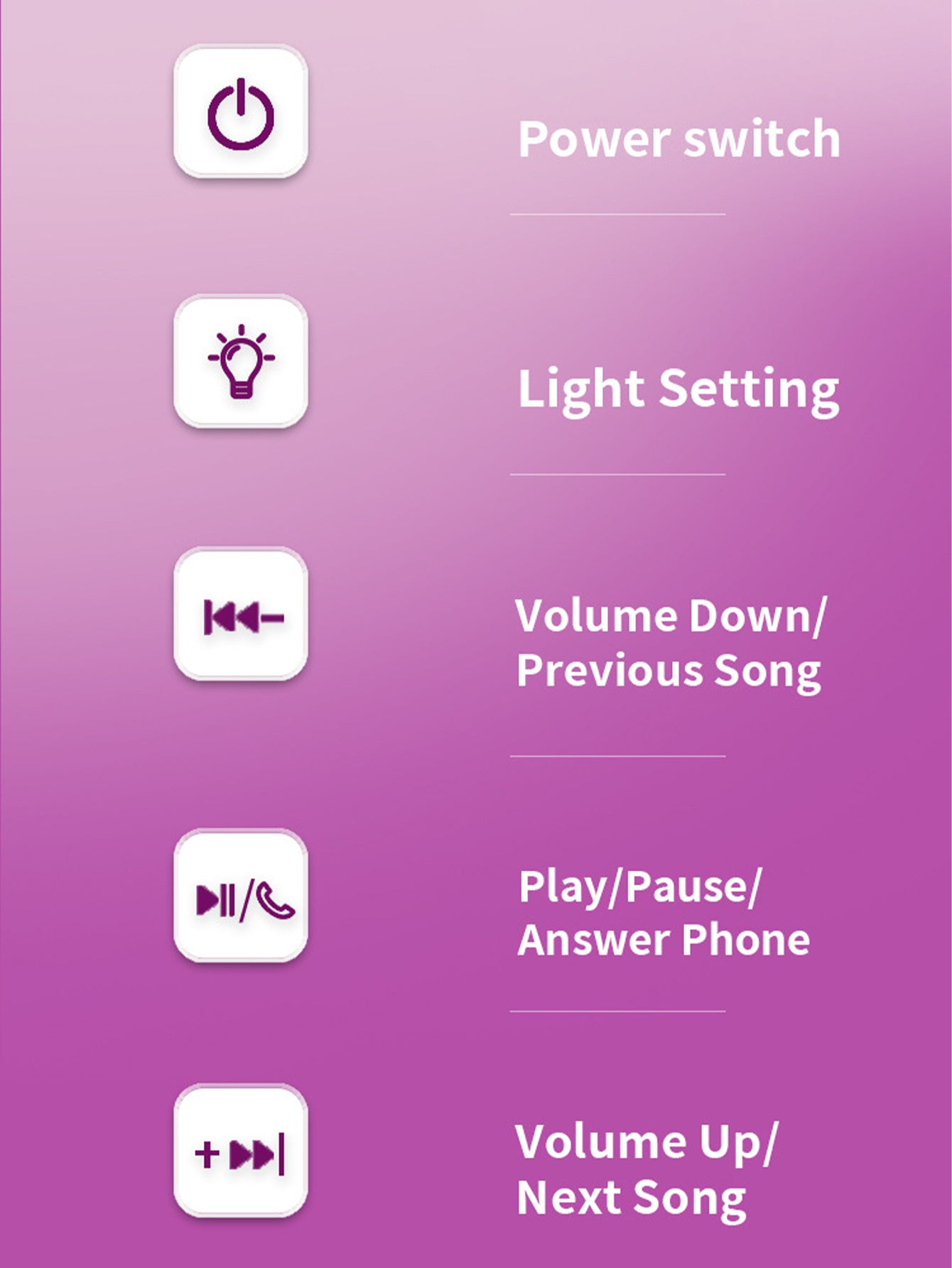 **Instructions**: ①Long press the power button to control the sound; ②Short press to switch the light mode; ③Wireless charging needs to be aimed at the phone's sensing area.